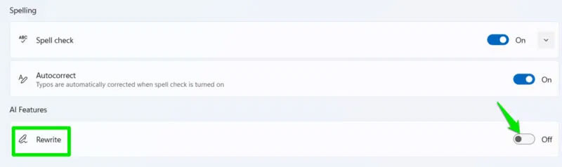Nhấp vào cài đặt Notepad bên cạnh nút Rewrite và tắt tùy chọn Rewrite trong phần AI Features.